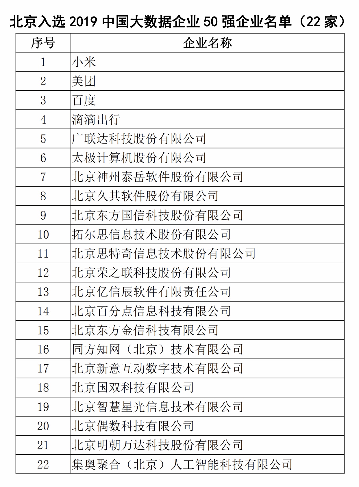 日前,在工业和信息化部、湖南省人民政府联合主办的2019世界计算机大会上,公布了“2019中国大数据企业50强”榜单,我市小米、美团、百度等22家软件企业入选,占全国44%,数量居全国首位。